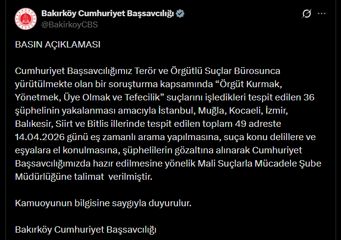 “Cumhuriyet Bașsavcılığımız Terör ve Örgütlü Suçlar Bürosunca yürütülmekte olan bir soruşturma kapsamında “Örgüt Kurmak, Yönetmek, Üye Olmak ve Tefecilik” suçlarını işledikleri tespit edilen 36 şüphelinin yakalanması amacıyla İstanbul, Muğla, Kocaeli, İzmir, Balıkesir, Siirt ve Bitlis illerinde tespit edilen toplam 49 adreste 14.04.2026 günü eş zamanlı arama yapılmasına, suça konu delillere ve eşyalara el konulmasına, şüphelilerin gözaltına alınarak Cumhuriyet Başsavcılığımızda hazır edilmesine yönelik Mali Suçlarla Mücadele Şube Müdürlüğüne talimat verilmiştir. Kamuoyunun bilgisine saygıyla duyurulur. “