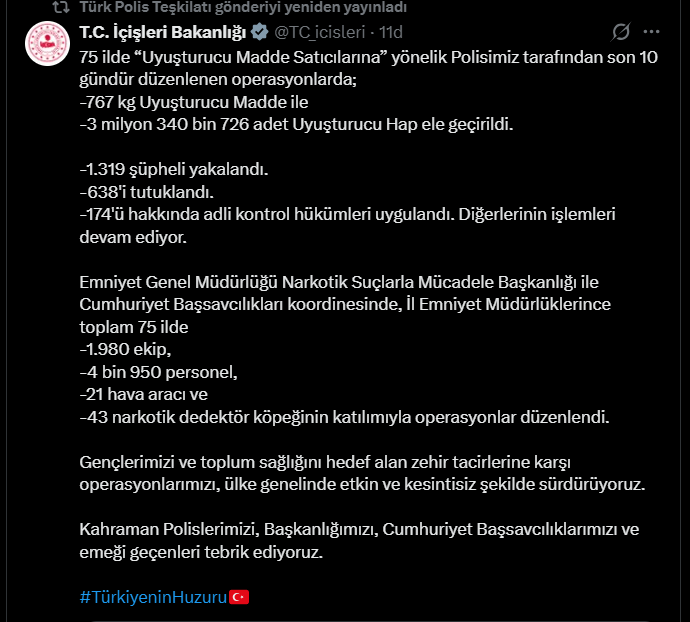 “75 ilde “Uyuşturucu Madde Satıcılarına” yönelik Polisimiz tarafından son 10 gündür düzenlenen operasyonlarda; -767 kg Uyuşturucu Madde ile -3 milyon 340 bin 726 adet Uyuşturucu Hap ele geçirildi. -1.319 şüpheli yakalandı. -638'i tutuklandı. -174'ü hakkında adli kontrol hükümleri uygulandı. Diğerlerinin işlemleri devam ediyor. Emniyet Genel Müdürlüğü Narkotik Suçlarla Mücadele Başkanlığı ile Cumhuriyet Başsavcılıkları koordinesinde, İl Emniyet Müdürlüklerince toplam 75 ilde -1.980 ekip, -4 bin 950 personel, -21 hava aracı ve -43 narkotik dedektör köpeğinin katılımıyla operasyonlar düzenlendi. Gençlerimizi ve toplum sağlığını hedef alan zehir tacirlerine karşı operasyonlarımızı, ülke genelinde etkin ve kesintisiz şekilde sürdürüyoruz. Kahraman Polislerimizi, Başkanlığımızı, Cumhuriyet Başsavcılıklarımızı ve emeği geçenleri tebrik ediyoruz.”