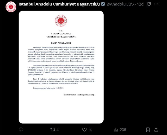 “Cumhuriyet Başsavcılığımız Terör ve Örgütlü Suçlar Soruşturma Bürosunca 2024/55140 numaralı soruşturma evrakı kapsamında alınan müşteki ifadeleri neticesinde devre mülk konusunda zarara uğramış müştekileri tespit ederek herhangi bir maddi karşılığı olmayan tapulari yabancı şahıslara yüksek kar vaadiyle satacaklarını beyan eden ve reklam bedeli adı altında satış sözleşmesi düzenlemek suretiyle www.devrenalsatkirala.com sitesi üzerinden satacakları konusunda ikna ederek dolandırıcılık suçunu işledikleri değerlendirilen şüphelilere ilişkin yürütülen soruşturma kapsamında kamuoyunu bilgilendirme ihtiyacı doğmuştur.
