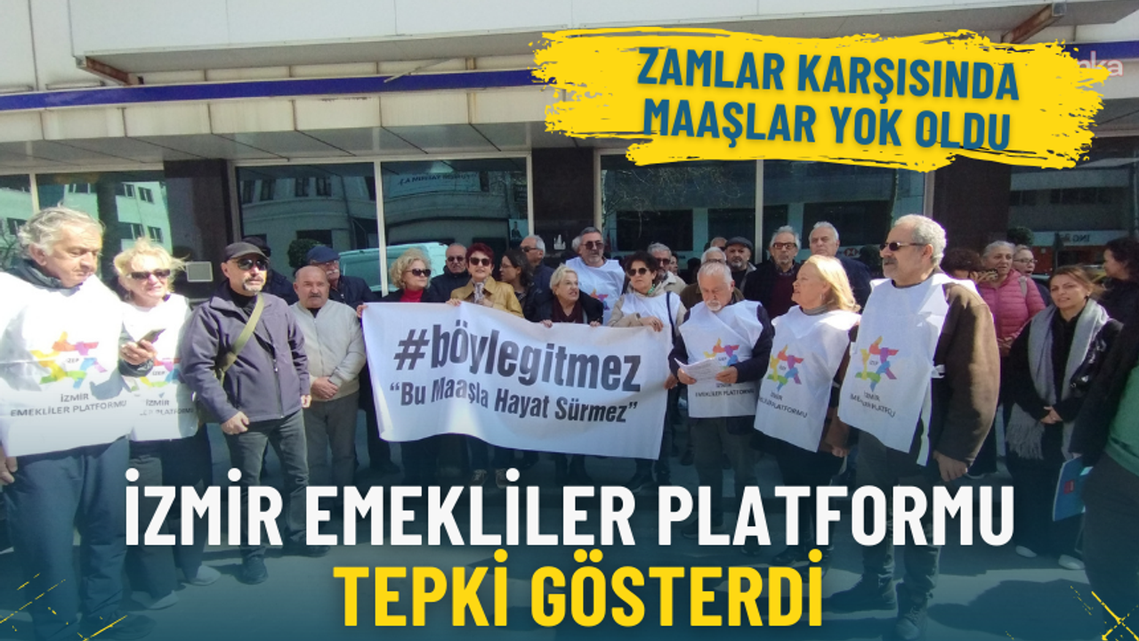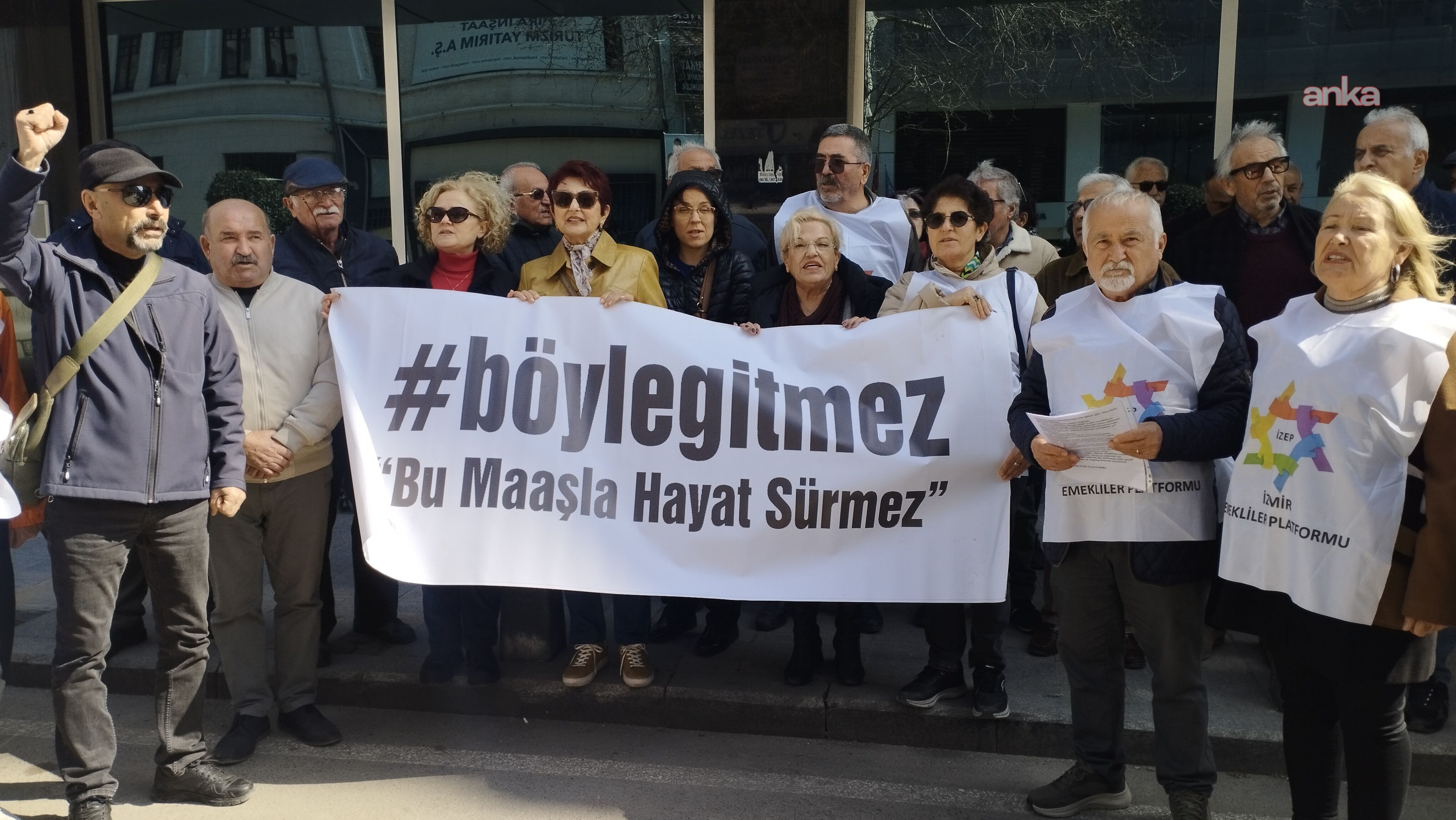 İzmir Emekliler Platformu üyeleri, “Bu maaşla hayat sürmez” sloganıyla SGK İzmir İl Müdürlüğü önünde eylem yaptı. Eylemde, "Cebimizden aldınız, paramızı çaldınız", "AKP şaşırdı, sabrımızı taşırdı", "Boş tencere kaynamaz emekli bunu unutmaz" sloganları atan emekliler, ek zam talebinde bulundu.