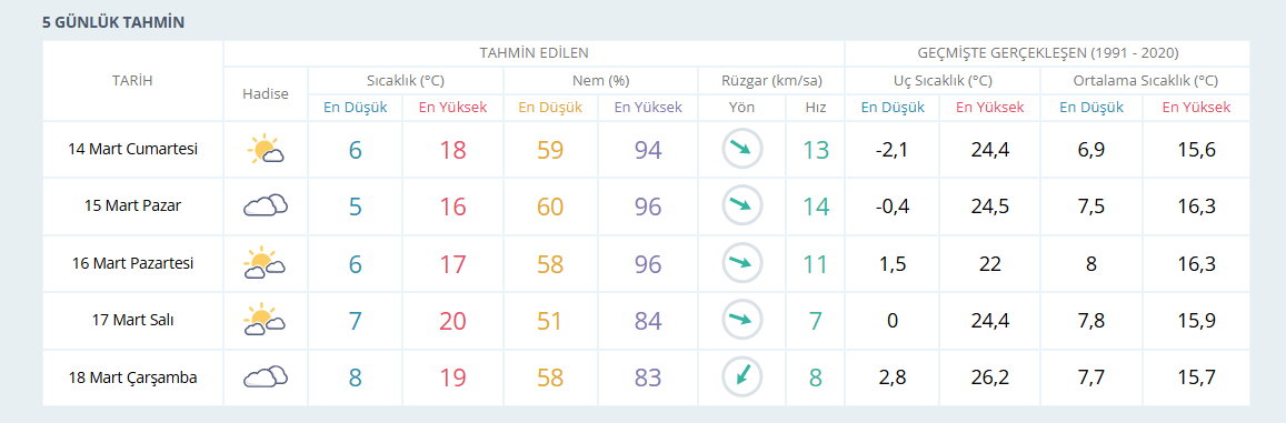 Meteoroloji verilerine göre 14 Mart Cumartesi günü İzmir genelinde parçalı bulutlu bir hava bekleniyor. Gün içinde sıcaklıkların yaklaşık 18 derece seviyelerinde seyretmesi tahmin ediliyor.