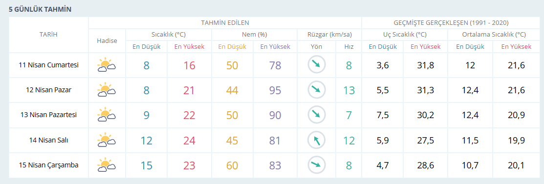 Meteoroloji tahminlerine göre 11 Nisan Cumartesi günü İzmir genelinde parçalı bulutlu bir hava bekleniyor. Bugün içerisinde sıcaklıkların 16 derece civarında seyretmesi öngörülüyor. 12 Nisan Pazar günü ise hava koşullarında önemli bir değişiklik beklenmezken sıcaklıkların artarak 21 dereceye kadar yükselmesi tahmin ediliyor. Parçalı bulutlu gökyüzü hafta sonu boyunca etkisini sürdürecek.