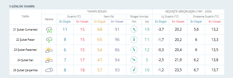 Meteoroloji verilerine göre İzmir’de 21 Şubat Cumartesi günü sağanak yağış bekleniyor. Gün içerisinde sıcaklığın 15 derece civarında olması öngörülüyor. 22 Şubat Pazar günü de yağışlı havanın kent genelinde etkisini sürdüreceği ve sıcaklıkların yine 15 derece civarında seyredeceği tahmin ediliyor.