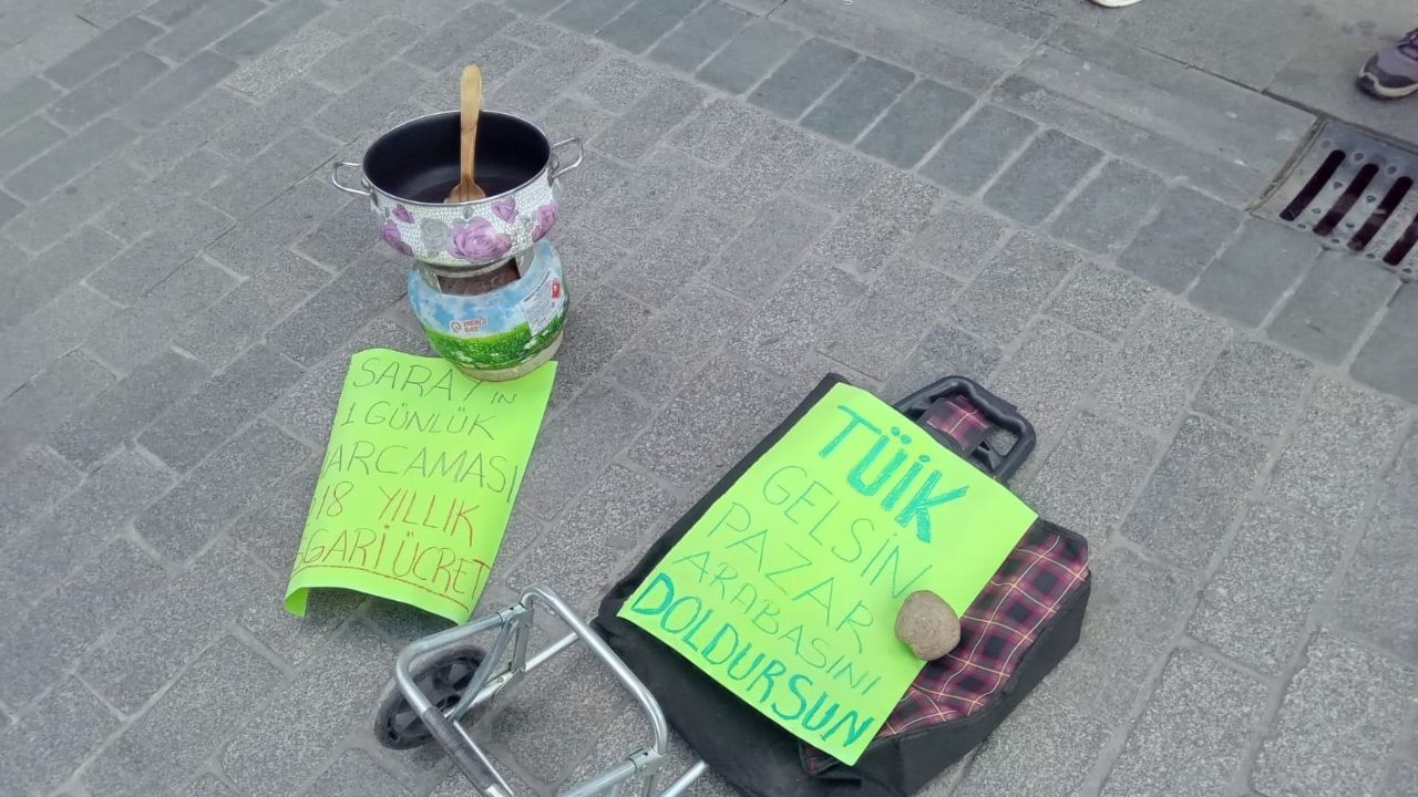 Bir tüpün üzerindeki tencerede “Sarayın 1 günlük harcaması 218 yıllık asgari ücret” yazarken, pazar arabasının üzerinde ise “TÜİK gelsin pazar arabasını doldursun” dövizleri yer aldı.