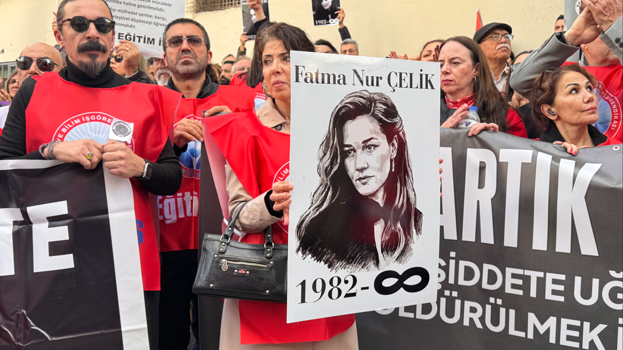 Açıklamada, öğretmen Fatma Nur Çelik'in öldürülmesi de protesto edildi. Eğitim-İş üyesi öğretmenler, İl Milli Eğitim Müdürlüğü kapısına İstanbul’da öldürülen öğretmen Fatma Nur Çelik’in anısına siyah kurdele bağladı.