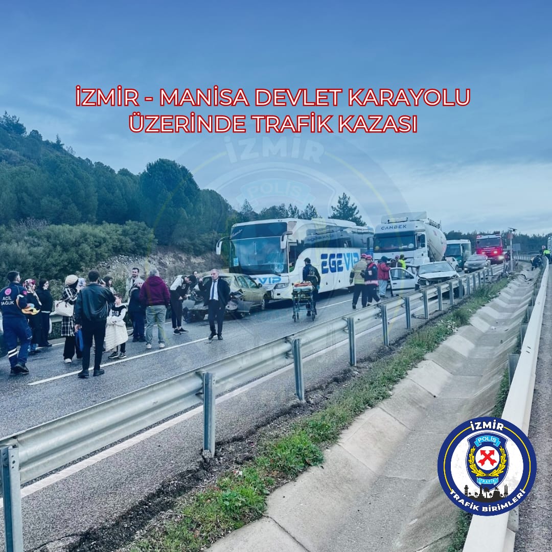 İzmir Emniyet Müdürlüğü tarafından yapılan açıklamaya göre İzmir–Manisa Devlet Karayolu üzeri İzmir istikametinde 3 araçlı yaralanmalı ve maddi hasarlı trafik kazası meydana geldi. Kaza sonrası güvenlik önlemleri alınarak yol trafiğe kapatıldı.