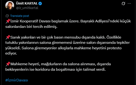 İz Gazete Genel Yayın Yönetmeni Ümit Kartal, sosyal medya hesabı üzerinden mahkemenin mağdurların salona alınmasını ve dışarıda bekleyenlerin koridoru boşaltmasını talimatlandırdığını şu ifadelerle aktardı: