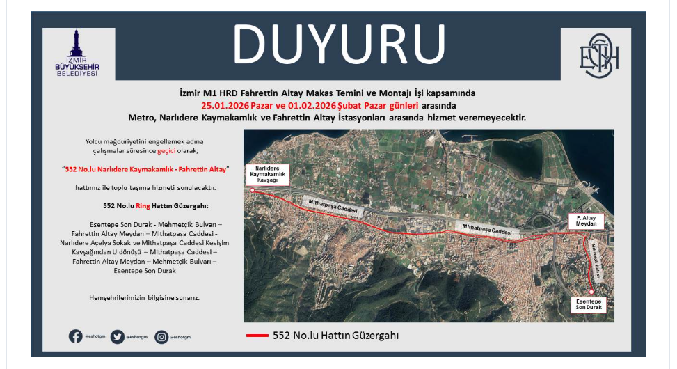 ESHOT’un paylaştığı bilgilere göre ring hattı, Esentepe Son Durak’tan başlayarak Mehmetçik Bulvarı, Fahrettin Altay Meydanı, Mithatpaşa Caddesi, Narlıdere Açelya Sokak ve Mithatpaşa Caddesi kesişim kavşağından U dönüşü yaparak aynı güzergah üzerinden Esentepe Son Durak’a ulaşacak. ESHOT Genel Müdürlüğü tarafından yapılan duyuruda şu ifadelere yer verildi: “İzmir M1 HRD Fahrettin Altay Makas Temini ve Montajı İşi kapsamında 25.01.2026 Pazar ve 01.02.2026 Şubat Pazar günleri arasında Metro, Narlıdere Kaymakamlık ve Fahrettin Altay İstasyonları arasında hizmet veremeyecektir. Yolcu mağduriyetini engellemek adına çalışmalar süresince geçici olarak; "552 No.lu Narlıdere Kaymakamlık-Fahrettin Altay hattımız ile toplu taşıma hizmeti sunulacaktır.