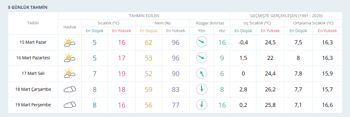 Meteoroloji verilerine göre İzmir'de 15 Mart Pazar günü hava sıcaklığının bir miktar düşmesi bekleniyor. Tahminlere göre İzmir genelinde sıcaklıkların 13-20 derece civarında olacağı ve parçalı bulutlu bir havanın etkili olacağı öngörülüyor.