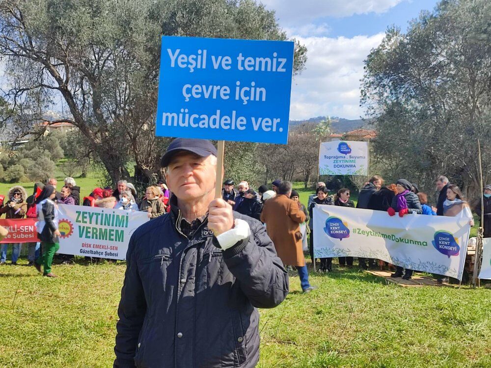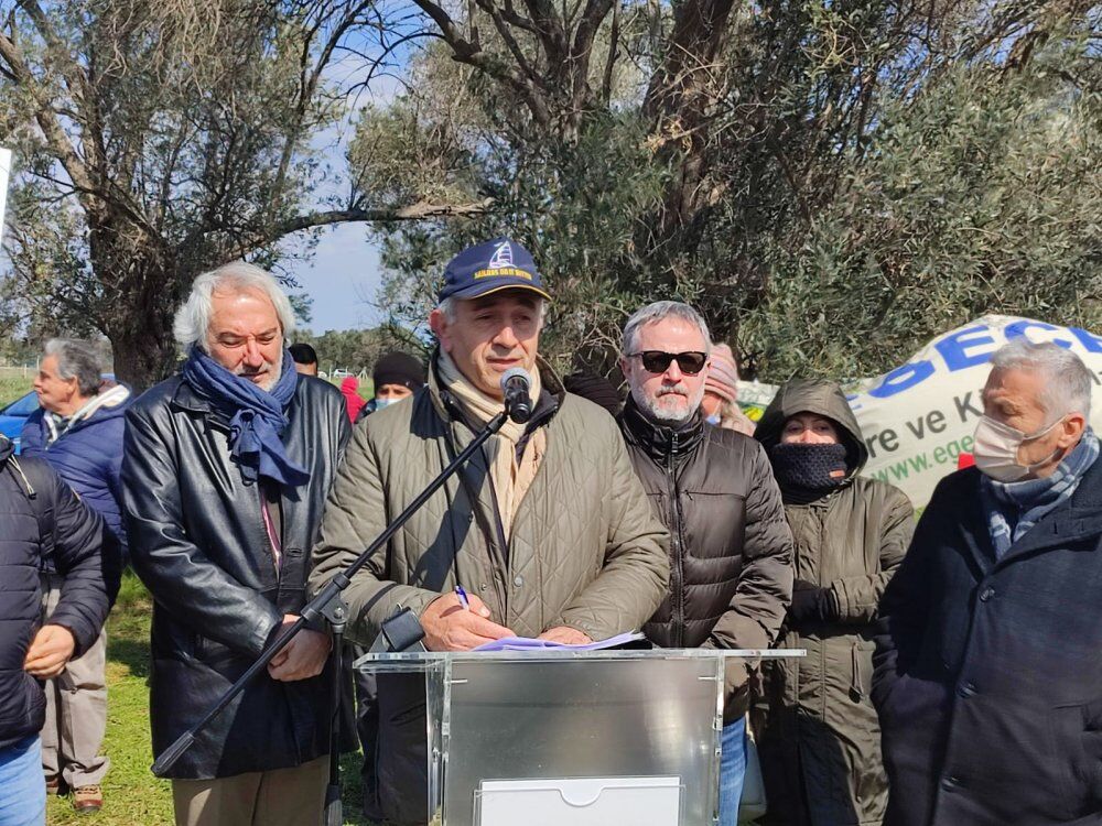 Eylemde ortak basın açıklamasını okuyan Çeşme Çevre Platformu Sözcüsü Ahmet Güler, “Bölgemiz çiftçilerinin en önemli gelir kaynaklarından olan zeytinciliğe yeni bir darbe daha vurulmak isteniyor! Zeytinliklerimiz enerji ve maden şirketlerinin yağma ve talan projelerine açılmak isteniyor! Zeytinliklerimizi koruyan 3573 Sayılı Zeytinciliğin Islahı ve Yabanilerinin Aşılattırılması Hakkında Kanun’u daha önce 8 kez değiştirmeye çalışan enerji ve maden lobileri, yasayı değiştirtemeyince çareyi bu kez Maden Yönetmeliğini değiştirtmekte buldu. Resmi Gazete’de yayınlanan ve Enerji ve Tabii Kaynaklar Bakanlığı tarafından hazırlanan “Maden Yönetmeliği’nde Değişiklik Yapılmasına Dair Yönetmelik” ile zeytinlikler iktidar tarafından enerji ve maden projelerine, kömüre feda edilmek isteniyor. Bizler daha ne oluyor derken bu yönetmelikten tam 4 gün sonra 05.03.2022 tarihinde bu sefer Çevre ve Şehircilik Bakanlığı tarafından 31769 sayılı Resmi Gazetede yayınlanarak Korunan Alanların Tespit, Tescil Ve Onayına İlişkin Usul Ve Esaslara Dair Yönetmelik’te değişiklik yapılıp, Nitelikli Koruma Alanlarında Rüzgar, Güneş ve Hidroelektrik santrallerinin yapımına da izin verildi. İktidar, tam da ülkemizin yanı başında bir savaş sürerken ve dikkatlerimiz bu savaşa yönelmişken bu değişikleri gerçekleştirerek zeytinliklerimizi, tarım alanlarımızı, doğal varlıklarımızı talanın yolunu açtı” açıklamalarında bulundu.