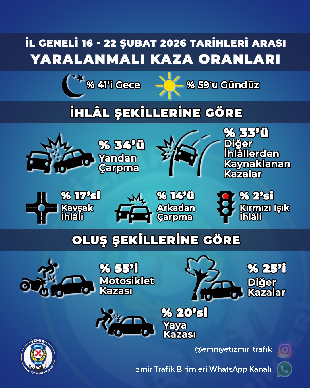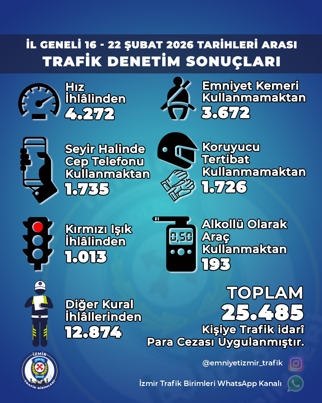 İzmir genelinde 16-22 Şubat 2026 tarihleri arasında gerçekleştirilen trafik denetimlerinin sonuçları kamuoyuyla paylaşıldı. Haftalık raporda sürücü ihlalleri ile trafik kazalarının oluş şekillerine ilişkin veriler yer aldı. Açıklanan rakamlara göre İzmir genelinde binlerce ihlal tespit edildi. İşte detaylar...
