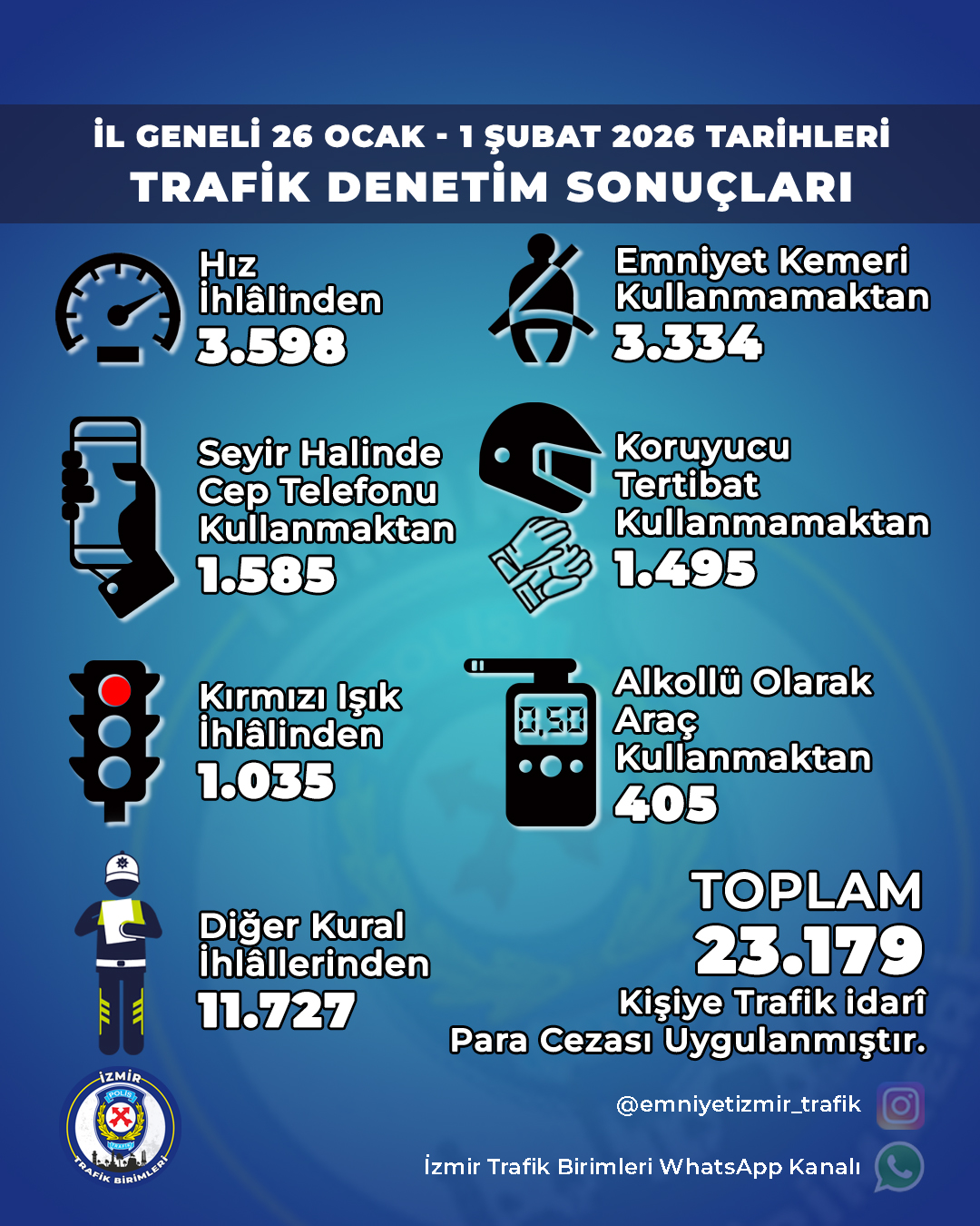 İzmir Trafik Birimleri tarafından açıklanan rapora göre kent genelinde yapılan denetimlerde toplam 23 bin 179 trafik idari para cezası karar tutanağı düzenlendi. Bu cezaların 11 bin 727’sinin farklı nedenlere bağlı olarak uygulandığı bildirildi.