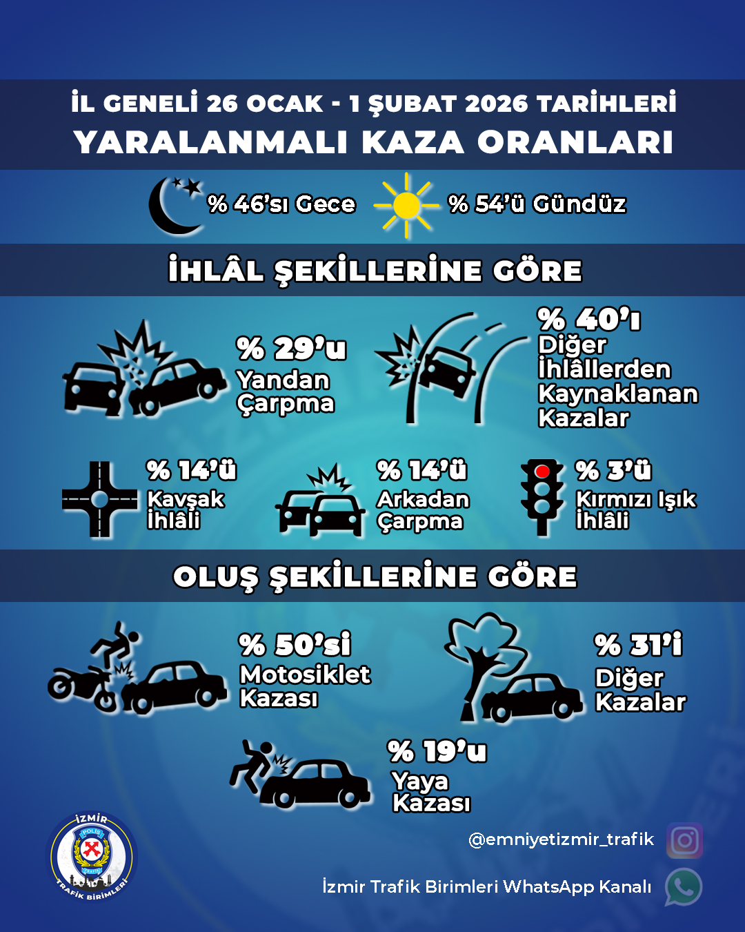 Kaza türlerine göre yapılan değerlendirmede yandan çarpma kazaları yüzde 29 oranıyla ilk sırada yer aldı. Yaya kazaları yüzde 19 olarak kayıtlara geçerken, arkadan çarpma kazaları yüzde 14 oranında gerçekleşti. Kavşak ihlallerine bağlı kazalar yüzde 14, kırmızı ışık ihlalinden kaynaklanan kazalar ise yüzde 3 oranında rapora yansıdı.
