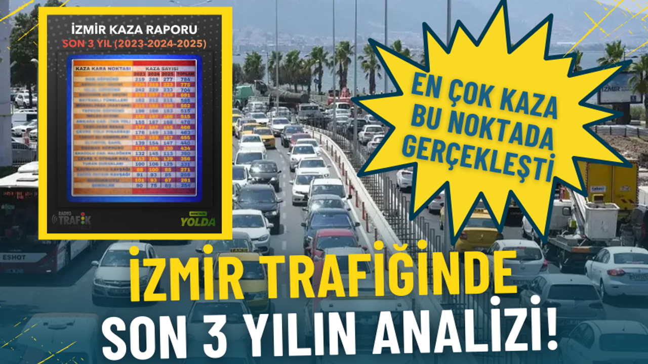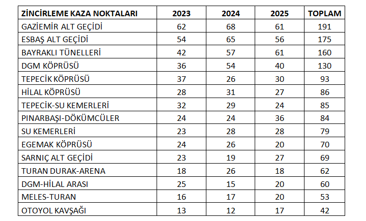 2023, 2024 ve 2025 yıllarında İzmir arterlerinde 3 bin 966 zincirleme trafik kazası meydana geldi. Son 3 yılın hepsinde Radyo Trafik İzmir haber merkezine en çok Gaziemir Alt Geçidi’nden zincirleme trafik kazası bilgisi geldi. Bu bölgedeki toplam 191 kazaya 3 ve daha fazla sayıda araç karıştı. Yine Akçay Caddesi’nde yer alan ESBAŞ Alt Geçidi 175 zincirleme kazaya sahne oldu. Çevre yollarının en kara noktası Bayraklı Tünelleri’nde toplam 160 zincirleme kaza meydana geldi.