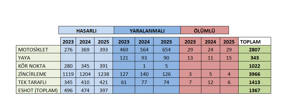Zincirleme, tek araçlık ve kör nokta kazalarındaki artış dikkat çekerken, belediye otobüslerinin karıştığı kazaların her yıl azaldığı görüldü.