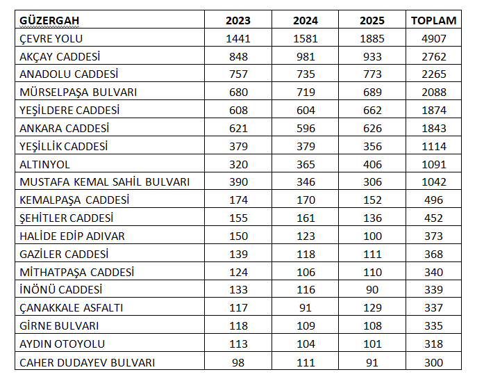 Akçay Caddesi, Anadolu Caddesi ve Mürselpaşa Bulvarı kazalarda dikkat çeken arterler olurken, Mustafa Kemal Sahil Bulvarı’nda son 3 yıllık dönemde kaza sayılarındaki azalış gözden kaçmadı.