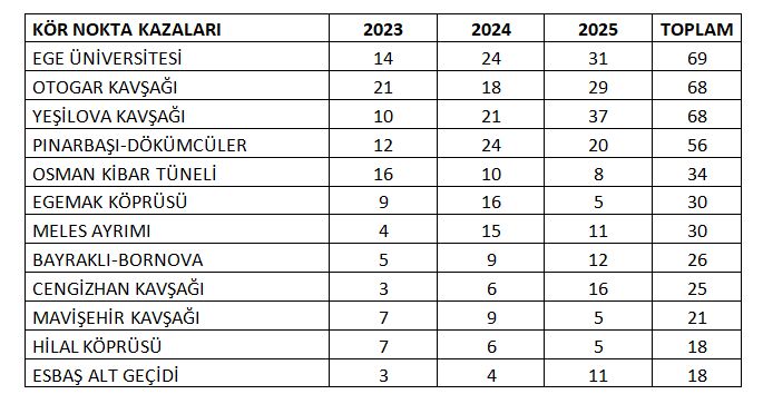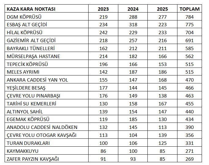 En çok kazanın meydana geldiği nokta her yıl değişirken, son 3 yılın ortalamasında DGM Köprüsü ilk sırada yer aldı. DGM Köprüsü’nde son 3 yılda yoğunluk oluşturan 784 trafik kazası meydana geldi. ESBAŞ Alt Geçidi (775), Hilal Köprüsü (704) ve Gaziemir Alt Geçidi (691) kazaların sıklıkla rastlandığı noktalar oldu. Çevre yollarında ise en fazla kaza Bayraklı Tünelleri’nde oldu.
