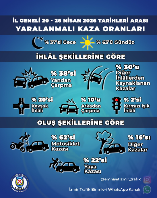 İzmir Emniyet Müdürlüğü Trafik Birimleri tarafından 20–26 Nisan 2026 tarihli açıklanan istatistiklere göre yaralanmalı trafik kazalarında motosikletlerin yüksek oranda yer aldığı görüldü. Kazaların yüzde 62’sinde motosikletler, yüzde 22’sinde yayalar ve yüzde 16’sında diğer kaza türleri yer aldı.