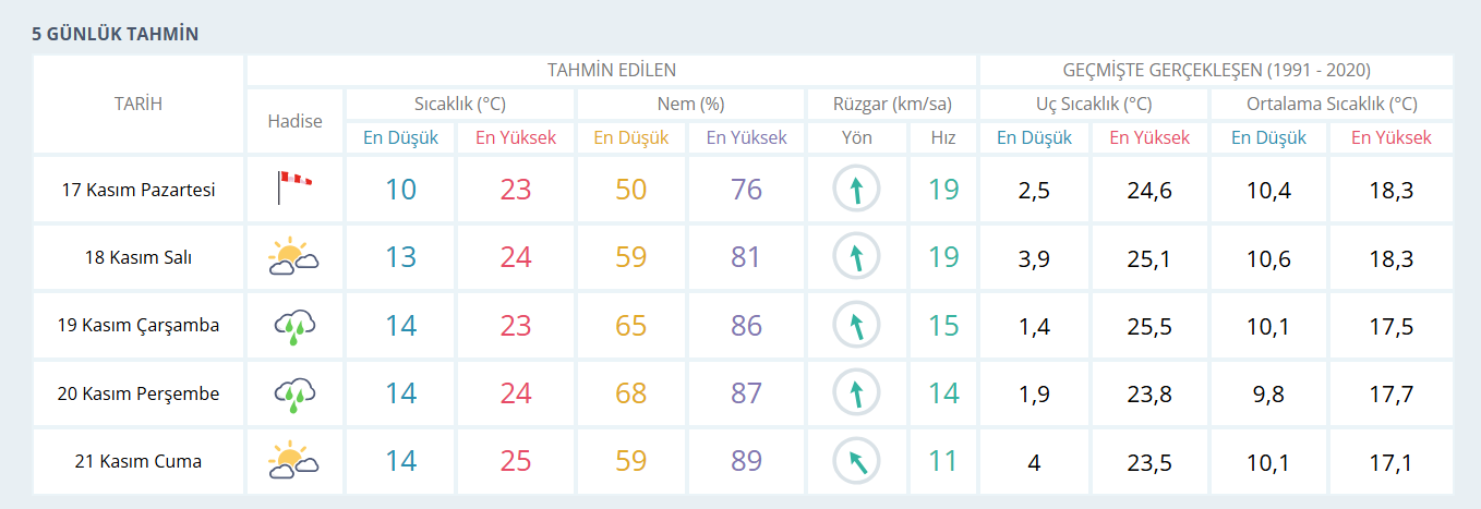 17 Kasım 2025 Pazartesi günü İzmir’de sıcaklık 23 derece olurken rüzgarlı bir hava etkili olacak. 18 Kasım Salı günü parçalı bulutlu ve 24 derece, 19 Kasım Çarşamba ise sağanak yağışlı ve 23 derecelik bir hava bekleniyor. 20 Kasım Perşembe günüde sağanak yağışın devam etmesi öngörülürken sıcaklık 24 derece olacak. Meteroloji'nin verilerine göre 21 Kasım Cuma günü ise 25 derece ve parçalı bulutlu bir hava hakim olacak.