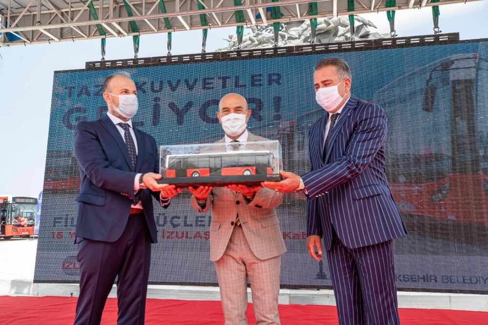 Konuşmaların ardından TEMSA sahibi Yaşar Özkan, TEMSA Teknik Satış Müdürü İrfan Özsevim ile birlikte Başkan Soyer’e dekotadan yapılmış büyük sembolik otobüs anahtarı ve otobüs maketi verdi.