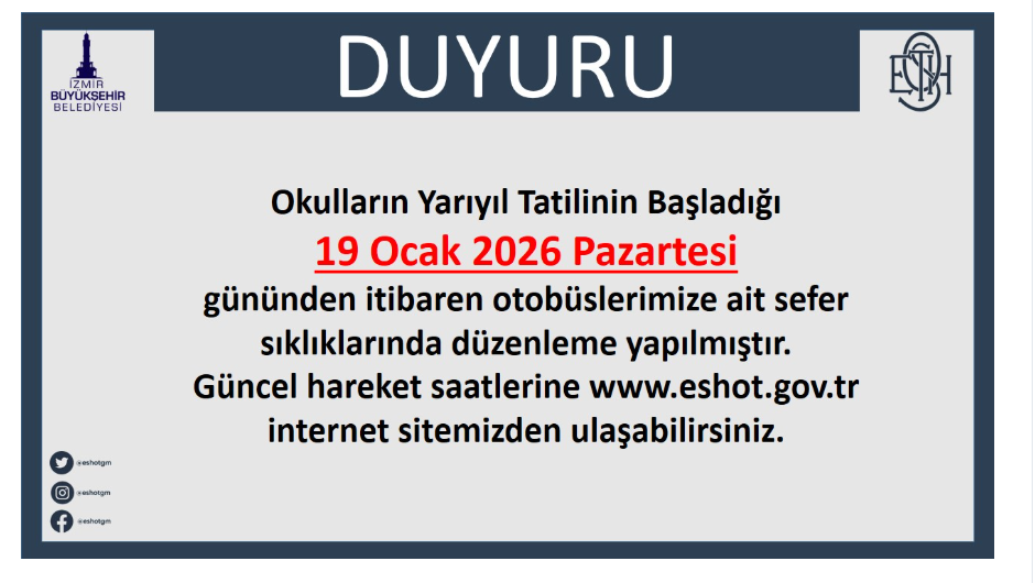 İzmir Büyükşehir Belediyesi ESHOT Genel Müdürlüğü tarafından yapılan açıklamada, okulların yarıyıl tatiline girmesiyle birlikte toplu taşıma planlamasında değişikliğe gidildiği bildirildi. Açıklamada 19 Ocak 2026 Pazartesi gününden itibaren otobüs sefer sıklıklarının güncellendiği belirtilerek şu ifadelere yer verildi:“Okulların Yarıyıl Tatilinin Başladığı 19 Ocak 2026 Pazartesi gününden itibaren otobüslerimize ait sefer sıklıklarında düzenleme yapılmıştır. Güncel hareket saatlerine www.eshot.gov.tr internet sitemizden ulaşabilirsiniz.”