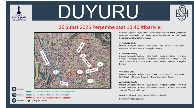 “26 Şubat 2026 Perşembe itibariyle; Barbaros Hayrettin Paşa Caddesi üzerinde yapılan Asfalt Serim Çalışmaları nedeniyle nedeniyle, 42 No.lu Çınartepe Gümrük ve 46 No.lu Çobançeşme Gümrük hatlarımızda;