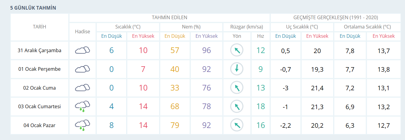 Meteoroloji Genel Müdürlüğü tarafından paylaşılan tahminlere göre yağışlı hava yılbaşı gecesinde de etkisini sürdürecek. 1 Ocak Perşembe günü yağış beklenmezken hava sıcaklığının 7 dereceye kadar düşmesi öngörülüyor. 2 Ocak Cuma günü ise parçalı bulutlu bir havanın etkili olacağı, sıcaklıkların yeniden 10 derece civarında seyredeceği tahmin ediliyor. 1 ve 2 Ocak tarihlerinde en düşük sıcaklığın 0 derece olması bekleniyor.