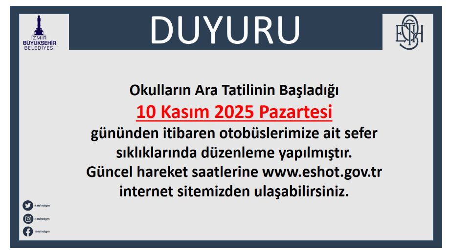 ESHOT Genel Müdürlüğü tarafından yapılan açıklamada şu ifadeler yer aldı: “10 Kasım 2025 Pazartesi gününden itibaren otobüslerimize ait sefer sıklıklarında düzenleme yapılmıştır. Güncel hareket saatlerine www.eshot.gov.tr internet sitemizden ulaşabilirsiniz.”