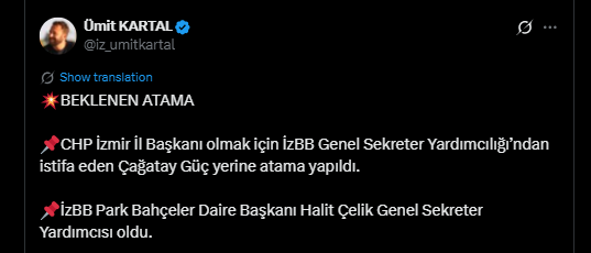 İzmir Büyükşehir Belediyesi’nde üst düzey görev değişikliği yaşandı. CHP İzmir İl Başkanı olmak için Genel Sekreter Yardımcılığı görevinden ayrılan Çağatay Güç’ün yerine atama gerçekleştirildi. İz Gazete Genel Yayın Yönetmeni Ümit Kartal, sosyal medya üzerinden gelişmeyi duyurdu.