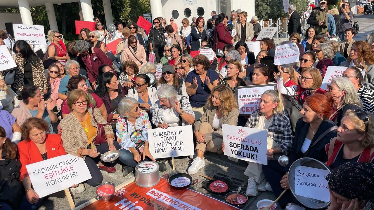 Cumhuriyet Halk Partisi (CHP) İzmir İl Kadın Kolları, 17 Ekim Dünya Yoksullukla Mücadele Günü dolayısıyla “Boş Tencere Yüzyılı Eylemi” gerçekleştirdi. CHP İzmir İl Başkanlığı önünde toplanan kadınlar, ellerinde boş tencere ve tavalarla ses çıkararak yoksulluğu protesto etti. “Emek var ekmek yok”, “AKP’den hesabı kadınlar soracak”, “Sarayda lüks sofrada yokluk” sloganları atan kadınlar, İl Başkanlığı önünden Kültürpark’a yürüdü. Basın açıklamasını CHP İzmir İl Kadın Kolları Başkanı Zahide Kurun yaptı.