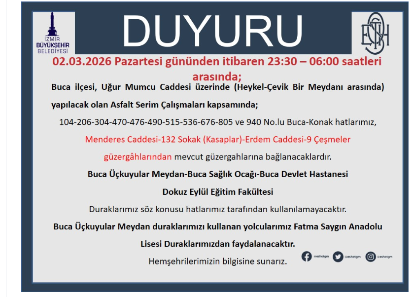 “02.03.2026 Pazartesi gününden itibaren 23:30 -06:00 saatleri arasında; Buca ilçesi, Uğur Mumcu Caddesi üzerinde (Heykel-Çevik Bir Meydanı arasında) yapılacak olan Asfalt Serim Çalışmaları kapsamında; 104-206-304-470-476-490-515-536-676-805 ve 940 No.lu Buca-Konak hatlarımız, Menderes Caddesi-132 Sokak (Kasaplar)-Erdem Caddesi-9 Çeşmeler güzergâhlarından mevcut güzergahlarına bağlanacaklardır.