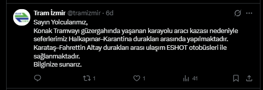 “Sayın Yolcularımız, Konak Tramvayı güzergahında yaşanan karayolu aracı kazası nedeniyle seferlerimiz Halkapınar–Karantina durakları arasında yapılmaktadır. Karataş–Fahrettin Altay durakları arası ulaşım ESHOT otobüsleri ile sağlanmaktadır. Bilginize sunarız.”