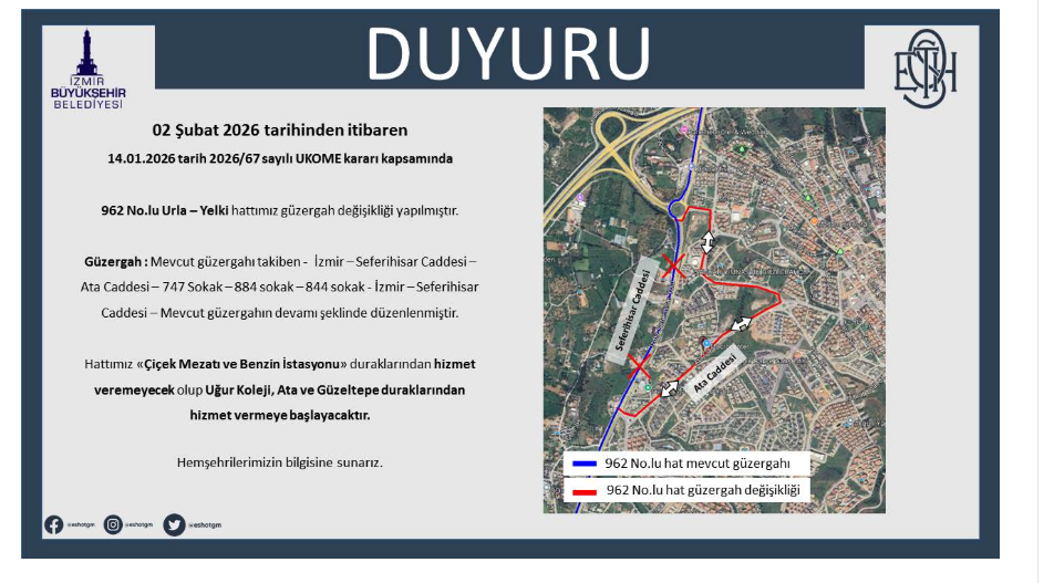 ESHOT Genel Müdürlüğü tarafından yapılan açıklamada şu ifadelere yer verildi: “02 Şubat 2026 tarihinden itibaren 962 No.lu Urla - Yelki hattımız güzergah değişikliği yapılmıştır. Güzergah : Mevcut güzergahı takiben- İzmir-Seferihisar Caddesi- Ata Caddesi-747 Sokak-884 sokak-844 sokak-İzmir-Seferihisar Caddesi-Mevcut güzergahın devamı şeklinde düzenlenmiştir.
