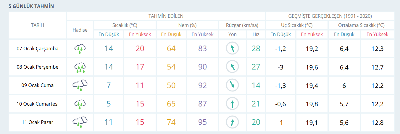 Meteoroloji Genel Müdürlüğü’nün tahminlerine göre İzmir’de hafta genelinde yağışlı hava etkisini sürdürecek. 8 Ocak Perşembe günü hava sıcaklığının 17 dereceye düşmesi ve sağanak yağışın devam etmesi bekleniyor. 9 Ocak Cuma günü sıcaklığın 11 dereceye kadar gerilemesi ve sağanak yağışın etkili olması öngörülüyor. 10 Ocak Cumartesi günü hava sıcaklığının 15 derece civarında seyretmesi ve yağışın sürmesi beklenirken, 11 Ocak Pazar günü sıcaklığın 11 dereceye düşmesi ve yağışlı havanın devam etmesi tahmin ediliyor.