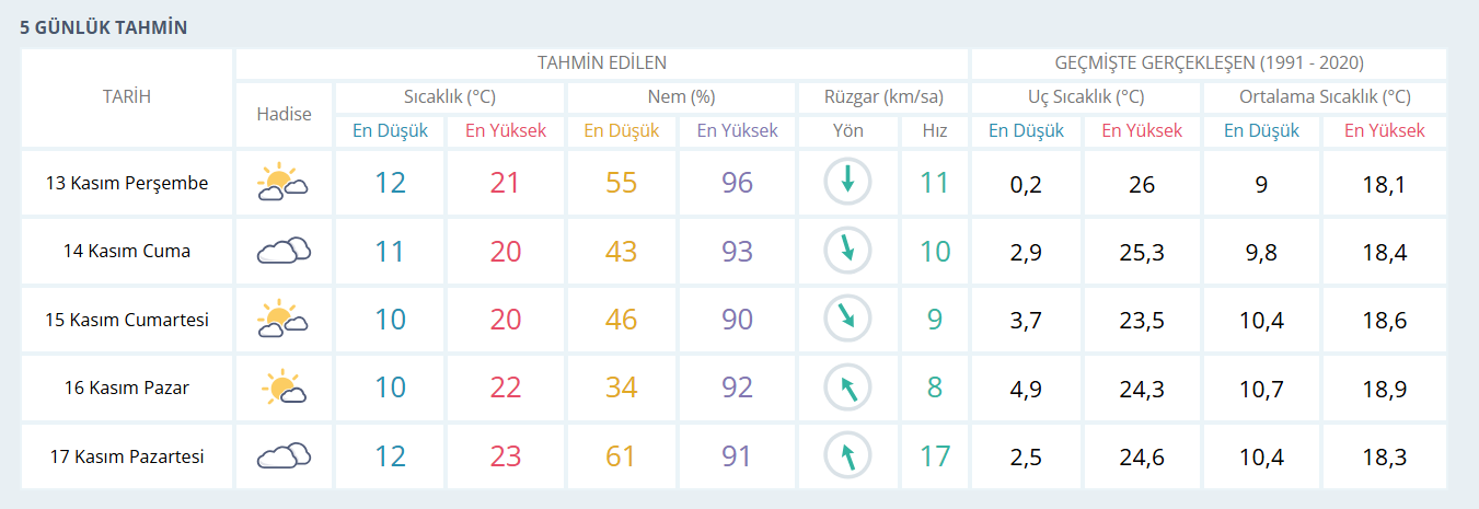 14 Kasım Cuma günü hava bulutlu olacak ve sıcaklık 20 dereceye kadar düşecek. Hafta sonu 15-16 Kasım’da ise sıcaklıklar 20-22 derece arasında değişecek ve gökyüzü hafta boyu bulutlu kalacak.