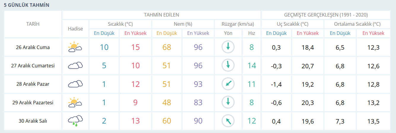 Meteoroloji verilerine göre 26 Aralık Cuma günü İzmir genelinde parçalı ve az bulutlu bir hava bekleniyor. Sabah saatlerinde bazı ilçelerde pus ve sis görüleceği tahmin ediliyor. Gün içerisinde en yüksek hava sıcaklığının 15 derece civarında olacağı öngörülüyor.