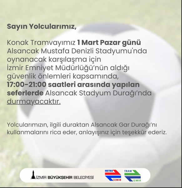 “Sayın Yolcularımız, Konak Tramvayımız 1 Mart Pazar günü Alsancak Mustafa Denizli Stadyumu'nda oynanacak karşılaşma için İzmir Emniyet Müdürlüğü'nün aldığı güvenlik önlemleri kapsamında, 17:00-21:00 saatleri arasında yapılan seferlerde Alsancak Stadyum Durağı'nda durmayacaktır. Yolcularımızın, ilgili duraktan Alsancak Gar Durağı'nı kullanmalarını rica eder, anlayışınız için teşekkür ederiz.”