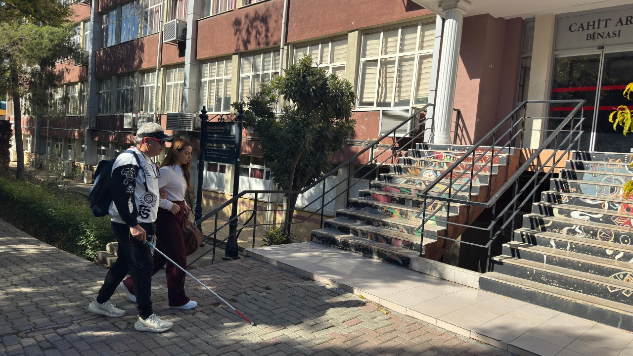 Konak ilçesi Hatay semtindeki evinden otobüsle fakültenin önüne gelen Yaşar'ı her gün bir sınıf arkadaşı kapıda karşılıyor, merdivenleri çıkmasında ve kantin gibi ihtiyaçlarını karşılamasında yardımcı oluyor.
