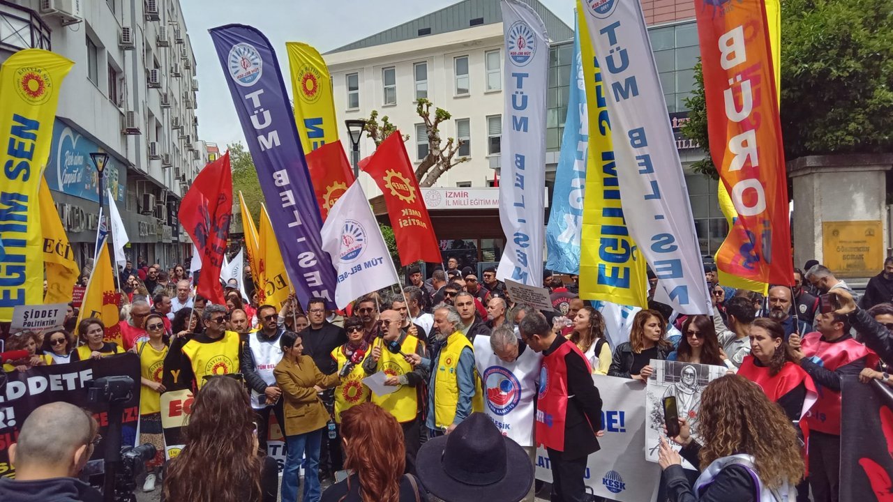 İzmir’de eğitim emekçilerinin okullarda artan şiddete karşı başlattığı eylemler üçüncü gününde de sürdü. Eğitim Sen İzmir şubeleri, KESK İzmir Şubeler Platformu ve Birleşik Kamu-İş’e bağlı sendikaların çağrısıyla bir araya gelen eğitimciler, 15 Nisan’dan bu yana devam eden iş bırakma eylemini sokaklara taşıdı. Konak’ta toplanan kalabalık, Milli Eğitim Müdürlüğü’ne yürürken hem son dönemde yaşanan okul saldırılarına hem de eğitim politikalarına tepki gösterdi.