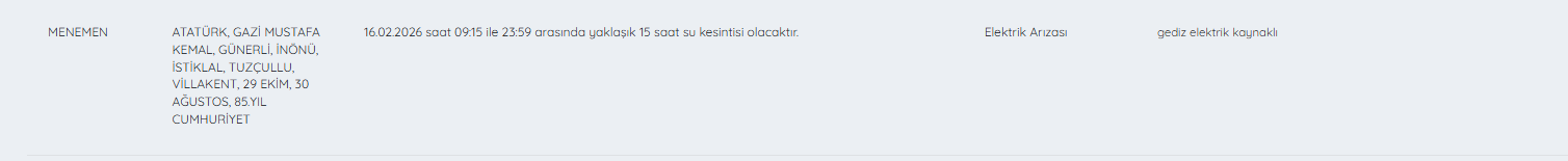 İzmir Su ve Kanalizasyon İdaresi (İZSU) tarafından 16 Şubat 2026 tarihli açıklamaya göre İzmir genelinde bazı ilçelerde belirli saat aralıklarında su kesintileri yaşanacak Bu bağlamda İzmir'de son dakika Bornova, Güzelbahçe, Karabağlar ve Menderes ilçelerinin bazı mahallelerine belirli saatlerde su verilemeyecek. Menemen'de ise elektrik arızası kaynaklı 15 saatlik bir su kesintisi uyarısı yapıldı.