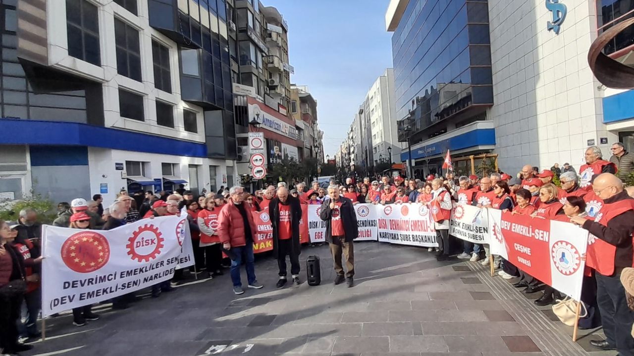 DİSK’e bağlı Devrimci Emekliler Sendikası (Dev Emekli-Sen) üyeleri, 10 Aralık Dünya İnsan Hakları Günü’nde “Emeklilere insanca yaşam hakkı” talebiyle Karşıyaka’da bir araya geldi. “Geçinemiyoruz, vergide adalet, gelirde adalet” sloganlarıyla Karşıyaka İZBAN önünde toplanan üyeler, iskele meydanına kadar yürüyüş gerçekleştirdi. Yürüyüşe Dev Emekli-Sen MYK üyesi Ercan Çınarlı, önceki dönem MDK Başkanı Hüseyin Özkaynak, şube başkanları ve çok sayıda sendika üyesi katıldı.