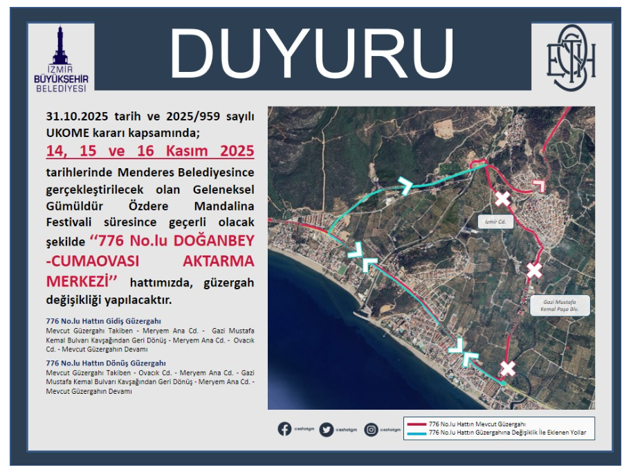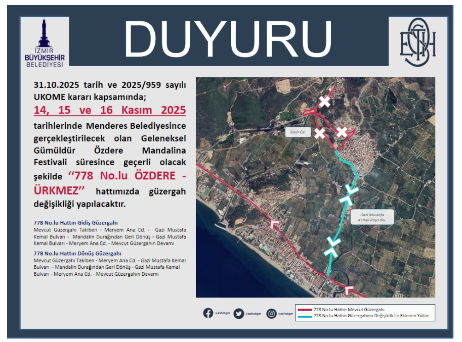 İzmir’in Menderes ilçesinde her yıl düzenlenen Geleneksel Gümüldür Özdere Mandalina Festivali için geri sayım başladı. Festival, 14, 15 ve 16 Kasım 2025 tarihlerinde gerçekleştirilecek. Festival süresince bazı ESHOT hatlarında geçici güzergah değişiklikleri uygulanacak.