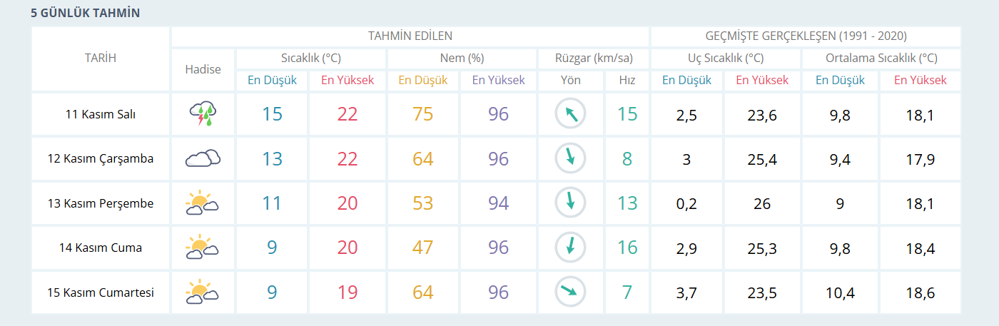 12 Kasım Çarşamba günü bulutlu bir hava hakim olacak ve sıcaklık yine 22 derece civarında seyredecek. 13 Kasım Perşembe ve 14 Kasım Cuma günlerinde ise hava az bulutlu olacak ancak sıcaklıkların 20 dereceye kadar düşeceği tahmin ediliyor.
