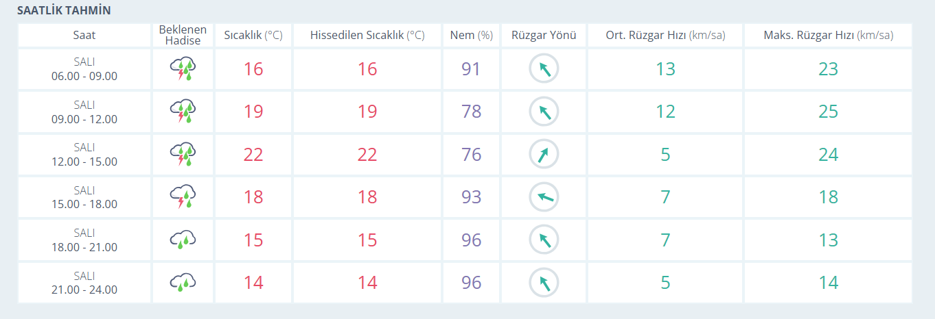 Meteoroloji’nin son tahminlerine göre İzmir genelinde kuvvetli sağanak yağışlar hemen her ilçede etkili olacak.İşte İzmir ilçelerinde bugün ön görülen hava durumu: Aliağa: Parçalı zamanla çok bulutlu, kuvvetli sağanak ve gökgürültülü sağanak yağışlı, 21°C, Balçova: Parçalı ve çok bulutlu, gece saatlerinde sağanak ve gökgürültülü sağanak yağışlı, 22°C, Bayındır: Parçalı zamanla çok bulutlu, aralıklı sağanak ve gökgürültülü sağanak yağışlı, 20°C, Bayraklı: Parçalı zamanla çok bulutlu, kuvvetli sağanak ve gökgürültülü sağanak yağışlı, 19°C, Bergama: Parçalı zamanla çok bulutlu, kuvvetli sağanak ve gökgürültülü sağanak yağışlı, 19°C, Beydağ: Parçalı zamanla çok bulutlu, aralıklı sağanak ve gökgürültülü sağanak yağışlı, 21°C, Bornova: Parçalı zamanla çok bulutlu, kuvvetli sağanak ve gökgürültülü sağanak yağışlı, 21°C, Buca: Parçalı zamanla çok bulutlu, kuvvetli sağanak ve gökgürültülü sağanak yağışlı, 20°C, Çeşme: Parçalı zamanla çok bulutlu, kuvvetli sağanak ve gökgürültülü sağanak yağışlı, 23°C, Çiğli: Parçalı zamanla çok bulutlu, kuvvetli sağanak ve gökgürültülü sağanak yağışlı, 20°C, Dikili: Parçalı zamanla çok bulutlu, kuvvetli sağanak ve gökgürültülü sağanak yağışlı, 20°C, Foça: Parçalı zamanla çok bulutlu, kuvvetli sağanak ve gökgürültülü sağanak yağışlı, 21°C, Gaziemir: Parçalı zamanla çok bulutlu, kuvvetli sağanak ve gökgürültülü sağanak yağışlı, 20°C, Güzelbahçe: Parçalı zamanla çok bulutlu, kuvvetli sağanak ve gökgürültülü sağanak yağışlı, 21°C, Karabağlar: Parçalı zamanla çok bulutlu, kuvvetli sağanak ve gökgürültülü sağanak yağışlı, 19°C, Karaburun: Parçalı zamanla çok bulutlu, kuvvetli sağanak ve gökgürültülü sağanak yağışlı, 19°C, Karşıyaka: Parçalı zamanla çok bulutlu, kuvvetli sağanak ve gökgürültülü sağanak yağışlı, 20°C, Kemalpaşa: Parçalı zamanla çok bulutlu, kuvvetli sağanak ve gökgürültülü sağanak yağışlı, 20°C, Kınık: Parçalı zamanla çok bulutlu, kuvvetli sağanak ve gökgürültülü sağanak yağışlı, 20°C, Kiraz: Parçalı zamanla çok bulutlu, aralıklı sağanak ve gökgürültülü sağanak yağışlı, 20°C, Konak: Parçalı zamanla çok bulutlu, kuvvetli sağanak ve gökgürültülü sağanak yağışlı, 22°C, Menderes: Parçalı zamanla çok bulutlu, kuvvetli sağanak ve gökgürültülü sağanak yağışlı, 20°C, Menemen: Parçalı zamanla çok bulutlu, kuvvetli sağanak ve gökgürültülü sağanak yağışlı, 20°C, Narlıdere: Parçalı zamanla çok bulutlu, kuvvetli sağanak ve gökgürültülü sağanak yağışlı, 20°C, Ödemiş: Parçalı zamanla çok bulutlu, aralıklı sağanak ve gökgürültülü sağanak yağışlı, 20°C, Seferihisar: Parçalı zamanla çok bulutlu, kuvvetli sağanak ve gökgürültülü sağanak yağışlı, 21°C, Selçuk: Parçalı zamanla çok bulutlu, kuvvetli sağanak ve gökgürültülü sağanak yağışlı, 21°C, Tire: Parçalı zamanla çok bulutlu, aralıklı sağanak ve gökgürültülü sağanak yağışlı, 22°C, Torbalı: Parçalı zamanla çok bulutlu, kuvvetli sağanak ve gökgürültülü sağanak yağışlı, 19°C, Urla: Parçalı zamanla çok bulutlu, kuvvetli sağanak ve gökgürültülü sağanak yağışlı, 20°C.