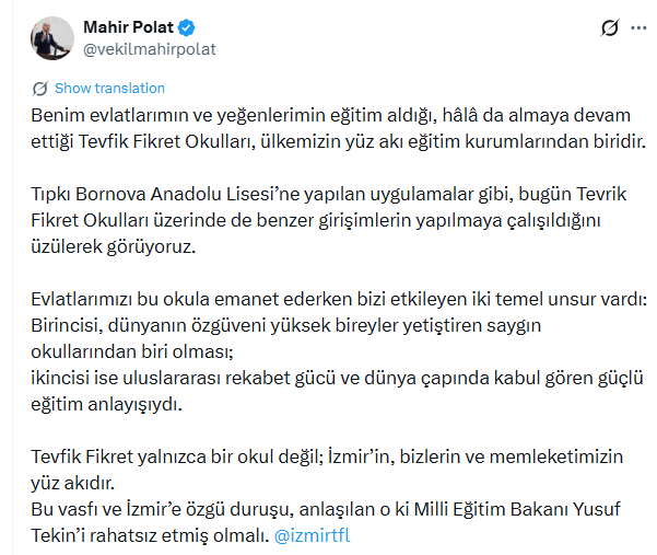 İzmir’de Tevfik Fikret Okulları hakkında ortaya atılan müfettiş iddiaları kamuoyunda tartışılmaya devam ederken, CHP İzmir Milletvekili Mahir Polat sosyal medya hesabından açıklama yaptı. Polat paylaşımda “Tevfik Fikret yalnızca bir okul değil; İzmir’in, bizlerin ve memleketimizin yüz akıdır. Bu vasfı ve İzmir’e özgü duruşu, anlaşılan o ki Milli Eğitim Bakanı Yusuf Tekin’i rahatsız etmiş olmalı.” ifadelerine yer verdi.