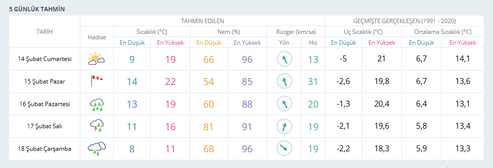 Meteoroloji Genel Müdürlüğü verilerine göre 14 Şubat Cumartesi günü İzmir’de parçalı bulutlu bir hava bekleniyor ve sıcaklığın 19 derece civarında seyretmesi öngörülüyor. 15 Şubat Pazar günü ise sıcaklıkların 22 dereceye kadar yükselmesi ve rüzgarlı bir havanın etkili olması tahmin ediliyor.