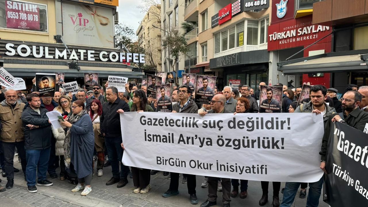 Gazeteci İsmail Arı’nın tutuklanmasının ardından İzmir’de demokratik kitle örgütleri, meslek odaları ve yurttaşlar Alsancak Kıbrıs Şehitleri Caddesi’nde bir araya geldi. Türkan Saylan Kültür Merkezi önünde yapılan açıklamaya BirGün Okurları İnisiyatifi, İzmir Gazeteciler Cemiyeti, Türkiye Gazeteciler Sendikası İzmir Şubesi, siyasi partiler ve çok sayıda sivil toplum örgütü katıldı.