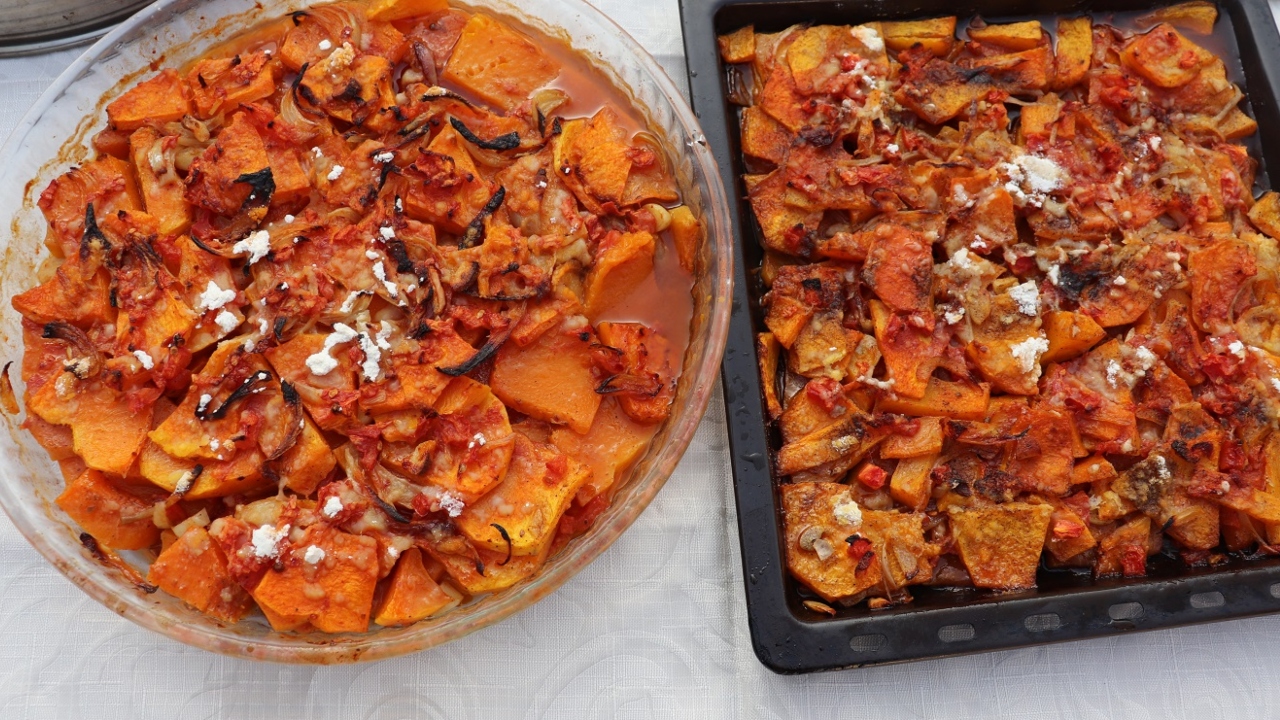 ilk önce orta büyüklükte bir tepsiyi zeytinyağı ile iyice yağlayın. Daha sonra kabukları soyulmuş bal kabaklarını yaklaşık kibrit kutusu büyüklüğünde ve 1 cm kalınlığında doğrayın. Bu doğranmış kabakları tepsinin tabanına düzgün bir şekilde dizin. Soğanları ikiye bölüp iri iri doğrayarak kabakların üzerine serpiştirin. Eğer domates kullanmak isterseniz onları salata tarzında veya yuvarlak dilimler halinde doğrayıp tepsiye ekleyin. Domatesiniz yoksa eğer salça ile de lezzet verebilirsiniz. Daha sonra ayıkladığınız sarmısakları eşit bir şekilde tepsiye dağıtın. Tuzunu da ilave ettikten sonra bolca zeytinyağı gezdirin. Son olarak karışıma bir bardak suyu yavaşça dökün. 180 derece fırında kontrol ederek 45 dk pişirin.