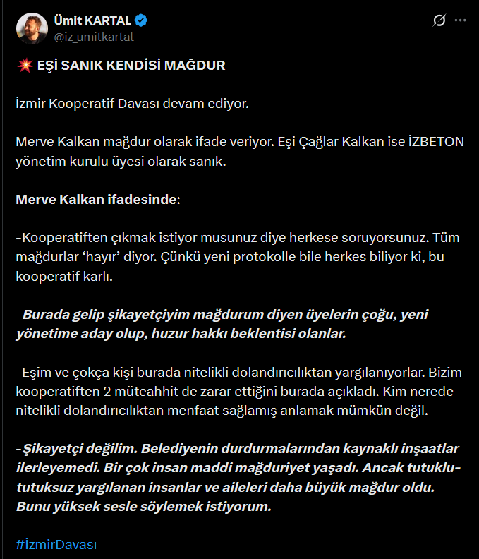 İzmir Kooperatif Davası devam ediyor. Merve Kalkan mağdur olarak ifade veriyor. Eşi Çağlar Kalkan ise İZBETON yönetim kurulu üyesi olarak sanık.