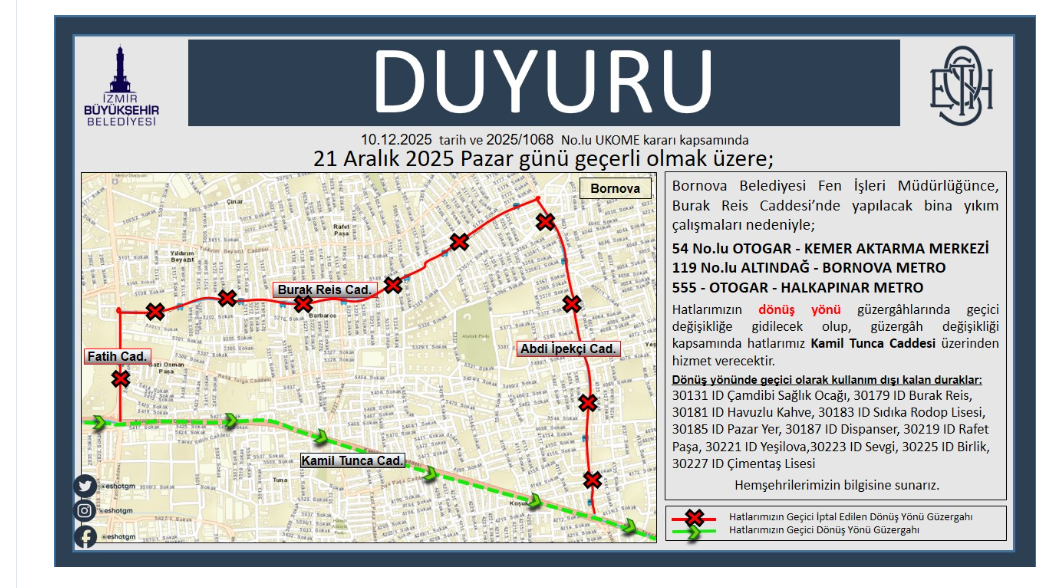 İzmir Büyükşehir Belediyesi ESHOT Genel Müdürlüğü tarafından gerçekleştirilen duyuruda şu ifadeler yer aldı: “21 Aralık 2025 Pazar günü geçerli olmak üzere; Bornova Belediyesi Fen İşleri Müdürlüğünce Burak Reis Caddesi'nde yapılacak bina yıkım çalışmaları nedeniyle; 54 No.lu OTOGAR - KEMER AKTARMA MERKEZİ, 119 No.lu ALTINDAĞ - BORNOVA METRO ve 555-OTOGAR - HALKAPINAR METRO Hatlarımızın dönüş yönü güzergâhlarında geçici değişikliğe gidilecek olup, güzergâh değişikliği kapsamında hatlarımız Kamil Tunca Caddesi üzerinden hizmet verecektir.